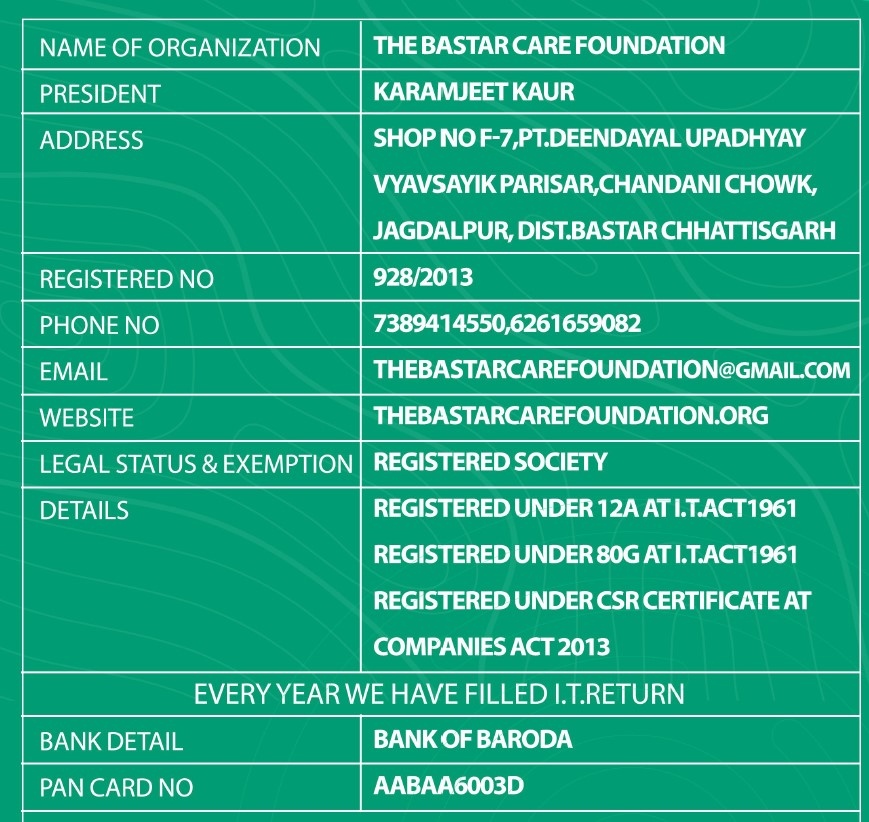 The Bastar Care Foundation is a nonprofit  non-religious social and development organization passionate to provide transformational development services for the complete wellbeing of humanity without social economic cultural, political, caste or class of exclusion. To improve the well-being and social position of the vulnerable people we work with through community  empowerment.